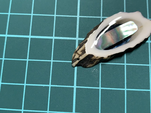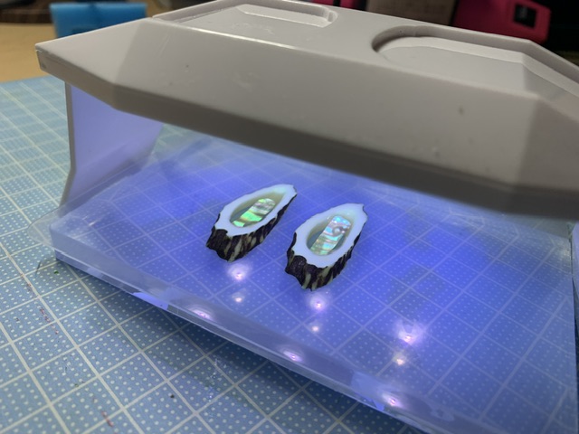 次に、UVレジンを少しだけ流し入れて、アワビ貝を好きな位置に配置。